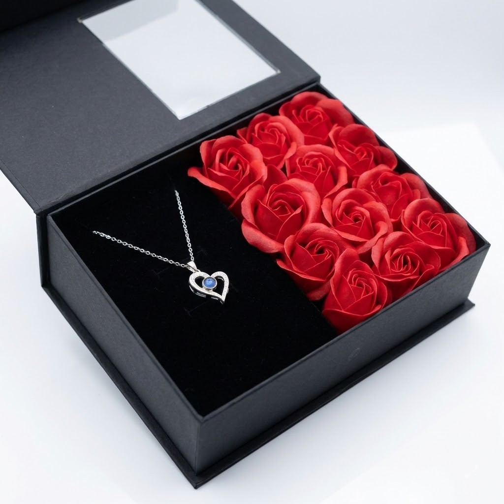 „Love Forever“ Poklon Kutija – Večne Ruže i Ogrlica „Volim Te na 100 Jezika“
