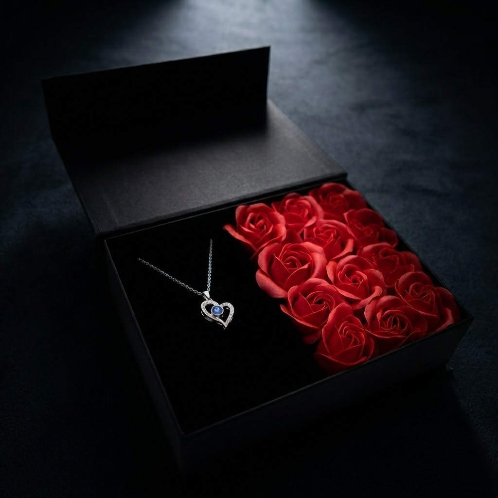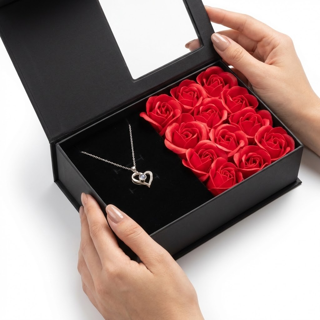Zaboravite na poklone koji skupljaju prašinu. „Love Forever“ je čista emocija upakovana u luksuz. Kroz prozirni prozorčić, ona odmah vidi savršen sklad – romantične crvene ruže i elegantan nakit koji oduzima dah.